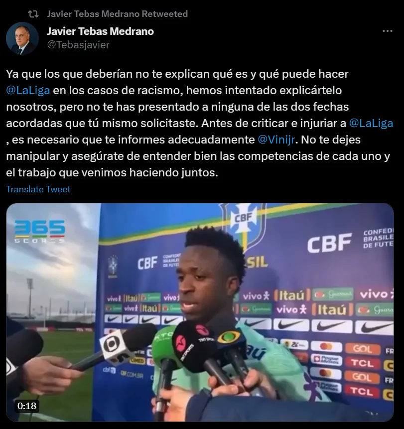 Con el correr de las horas, Vinícius Junior tuvo que aguantar las palabras del presidente de La Liga, Javier Tebas, quien puso énfasis en marcar que ese margen de acción está fuera de las competencias del organismo que manda, pero con una responsabilización también para el atacante madridista, autor de 10 goles y nueve asistencias en el certamen liguero.