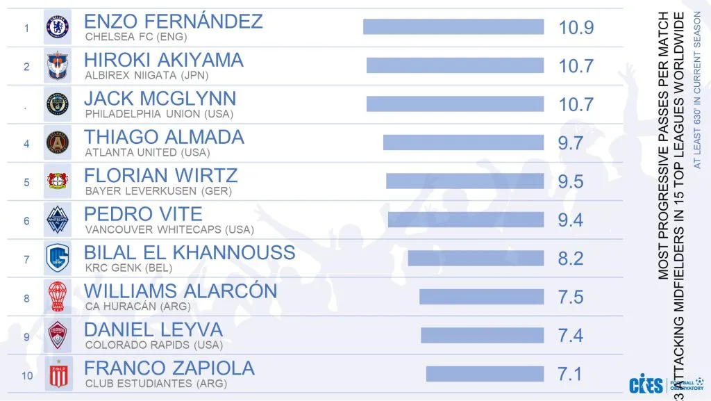 Muy por delante del chileno, quien comanda este estudio es el argentino Enzo Fernández, del Chelsea inglés, con 10.9 pases progresivos; seguido por el japonés Hiroki Akiyama y el estadounidense Jack McClynn, ambos con 10.7 asistencias por cotejo.