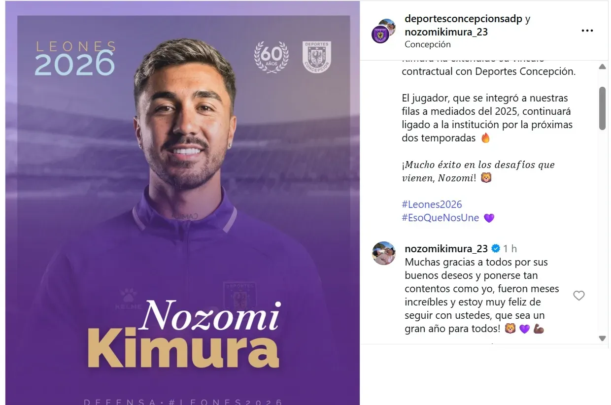 “Informamos que el defensor Nozomi Kimura ha extendido su vínculo contractual con Deportes Concepción. El jugador, que se integró a nuestras filas a mediados del 2025, continuará ligado a la institución por las próximas dos temporadas”, señaló Concepción en sus redes sociales.