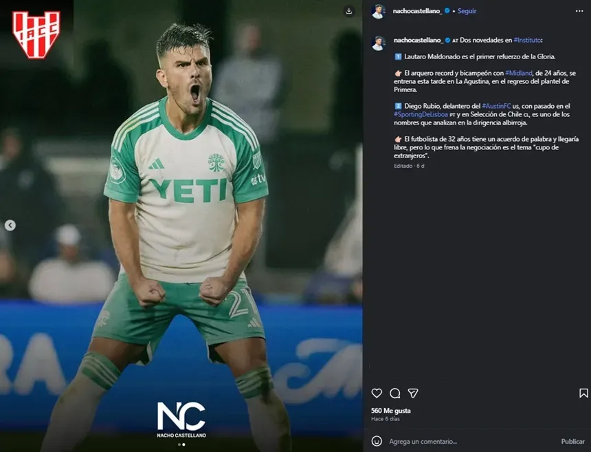 “Diego Rubio, delantero del #AustinFC 🇺🇸, con pasado en el #SportingDeLisboa 🇵🇹 y en Selección de Chile 🇨🇱, es uno de los nombres que analizan en la dirigencia albirroja” Señaló el comunicador en su cuenta de Instagram, para cerrar con la siguiente alarma: ‘👉🏻 El futbolista de 32 años tiene un acuerdo de palabra y llegaría libre, pero lo que frena la negociación es el tema “cupo de extranjeros”’.