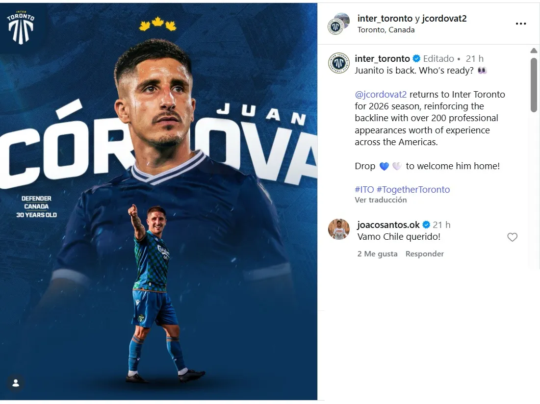 A través de sus redes, el Inter Toronto, equipo que compite en la Canadian Premier League, festejó con el regreso del jugador. “Juanito está de regreso. ¿Quién está listo? El jugador regresa al equipo para la temporada 2026, reforzando la línea defensiva con más de 200 apariciones profesionales de experiencia en todo el continente americano”.