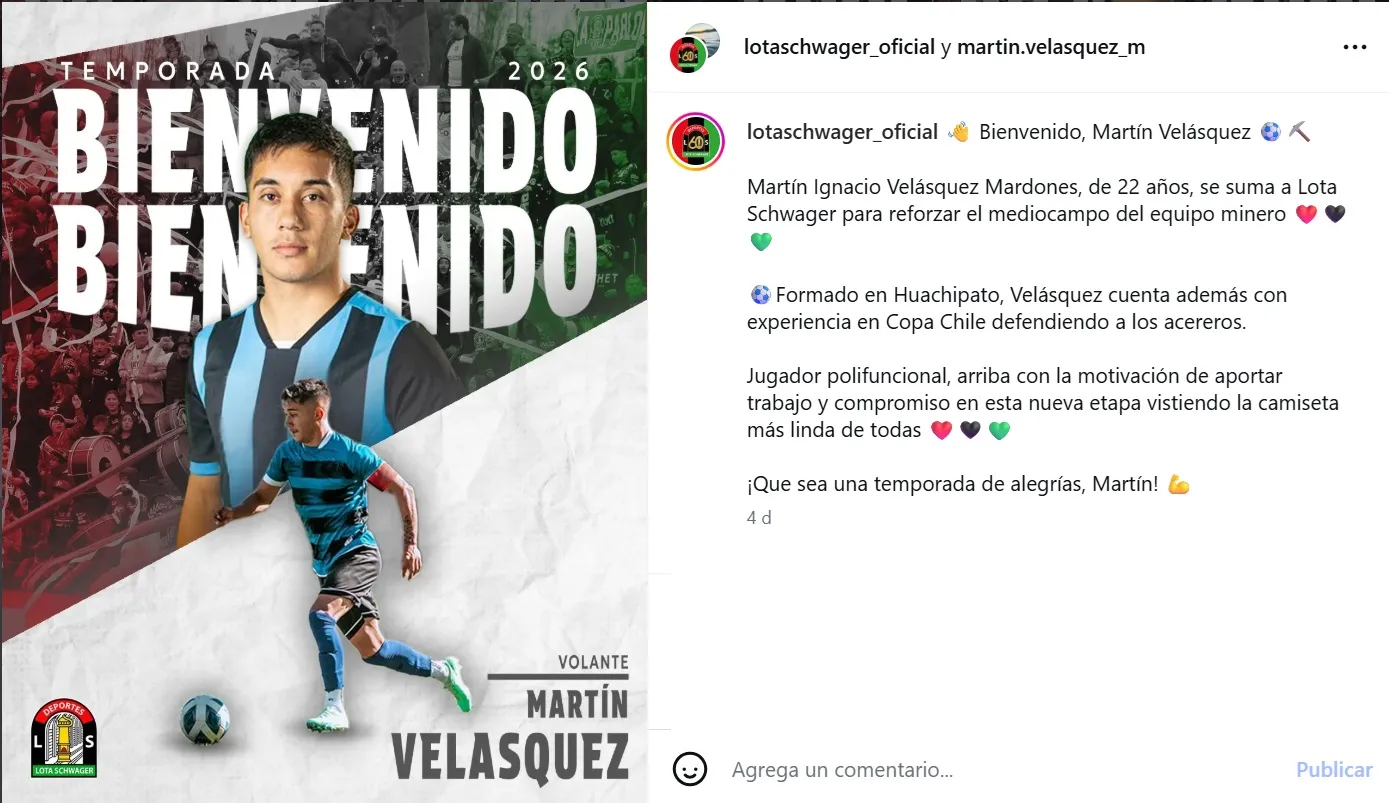“Bienvenido. Martín Ignacio Velásquez Mardones, de 22 años, se suma a Lota Schwager para reforzar el mediocampo del equipo minero. Formado en Huachipato, Velásquez cuenta además con experiencia en Copa Chile defendiendo a los acereros”, señaló el equipo en sus redes sociales.