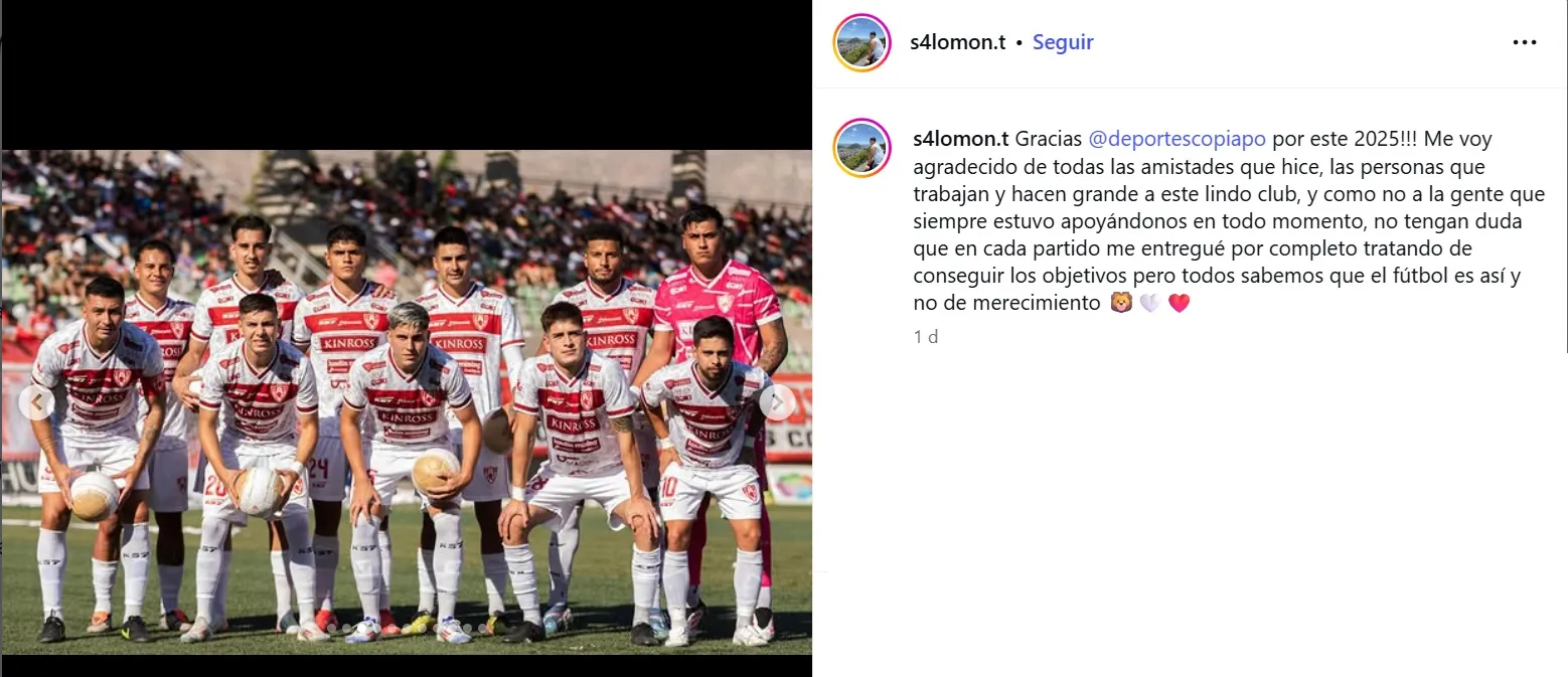 Carlos Salomón, defensor de 25 años y exjugador de Universidad Católica, reveló en sus redes sociales que se despide del club tras disputar 27 partidos este campeonato, convirtiéndose en una pieza importante del León de Atacama.