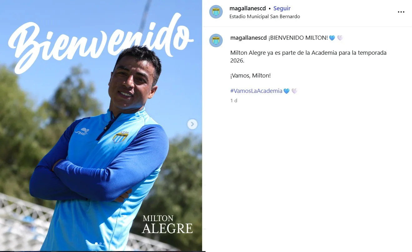 A través de sus redes, el equipo anunció el fichaje con un registro del jugador. “¡BIENVENIDO MILTON! Milton Alegre ya es parte de la Academia para la temporada 2026. ¡Vamos, Milton!”.