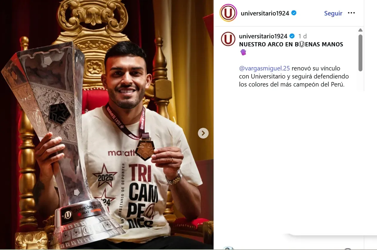 Miguel Vargas, portero formado en Universidad Católica, milita actualmente en Universitario de Deportes de la Liga Peruana, donde a través de sus redes sociales el club confirmó su renovación para el 2026.