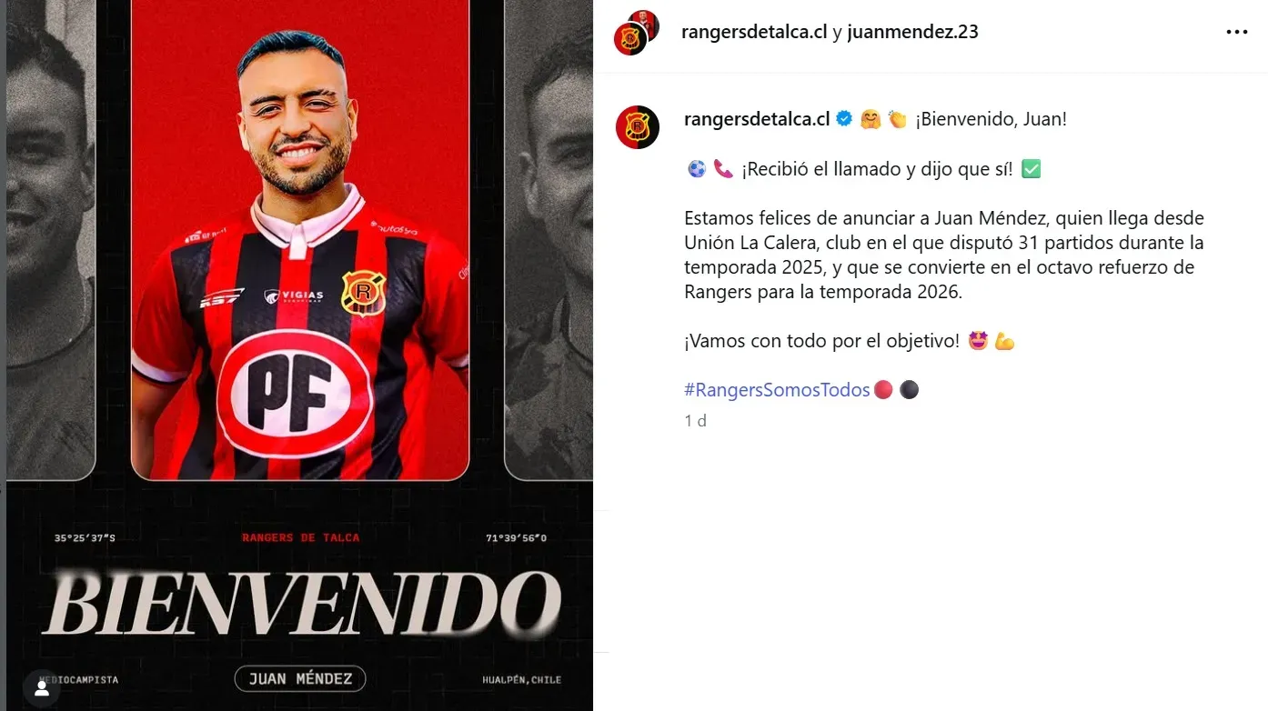 “¡Recibió el llamado y dijo que sí! Estamos felices de anunciar a Juan Méndez, quien llega desde Unión La Calera, club en el que disputó 31 partidos durante la temporada 2025, y que se convierte en el octavo refuerzo de Rangers para la temporada 2026″, reveló el equipo en sus redes sociales.