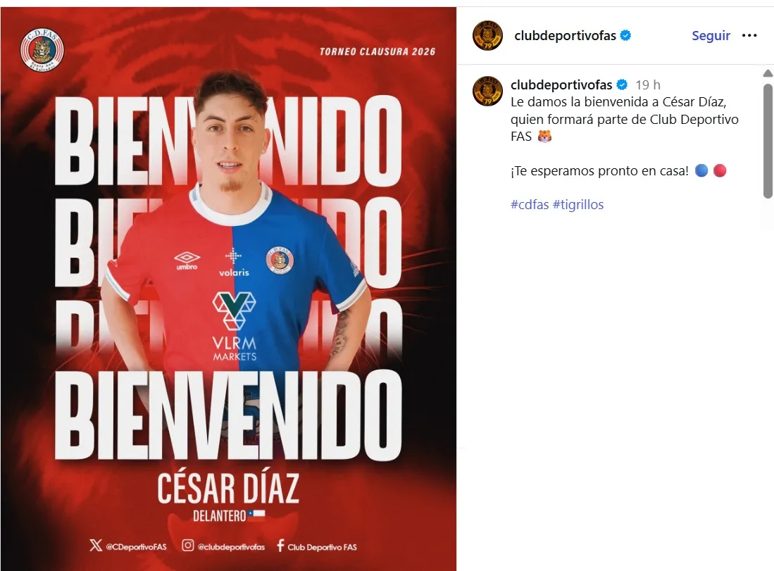 “Le damos la bienvenida a César Díaz, quien formará parte de Club Deportivo FAS. ¡Te esperamos pronto en casa!”, reveló el equipo que se ha coronado campeón de su liga en 19 oportunidades a través de sus redes.