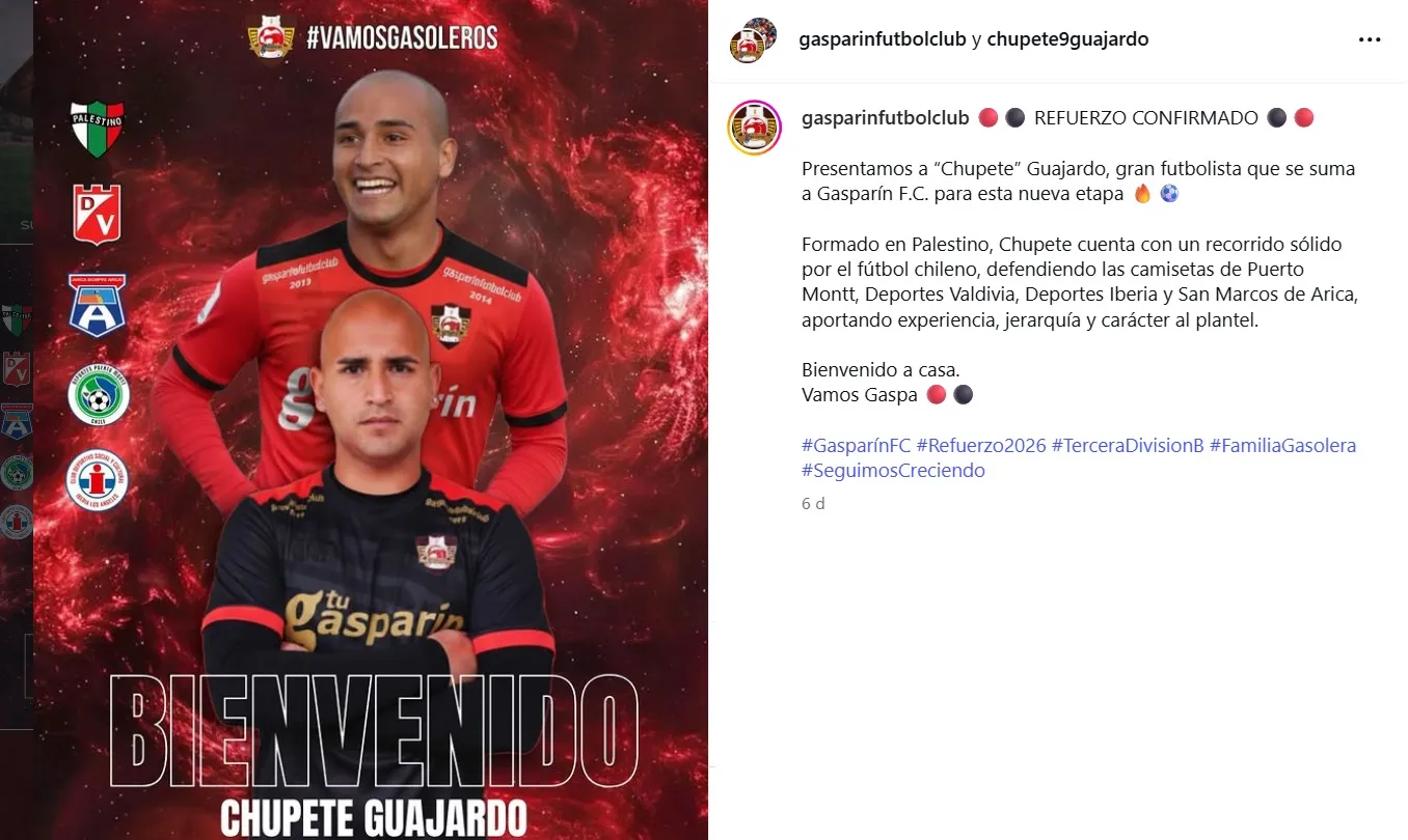 “Refuerzo confirmado. Presentamos a “Chupete” Guajardo, gran futbolista que se suma a Gasparín F.C. para esta nueva etapa. Formado en Palestino, Chupete cuenta con un recorrido sólido por el fútbol chileno, defendiendo las camisetas de Puerto Montt, Deportes Valdivia, Deportes Iberia y San Marcos de Arica”.