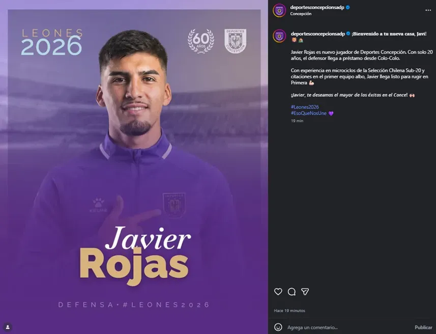 “¡Bienvenido a tu nueva casa, Javi! 🦁🏡” fueron las primeras palabras dedicadas al joven lateral por parte del elenco del Biobío, para luego añadir: “Javier Rojas es nuevo jugador de Deportes Concepción. Con solo 20 años, el defensor llega a préstamo desde Colo-Colo”.