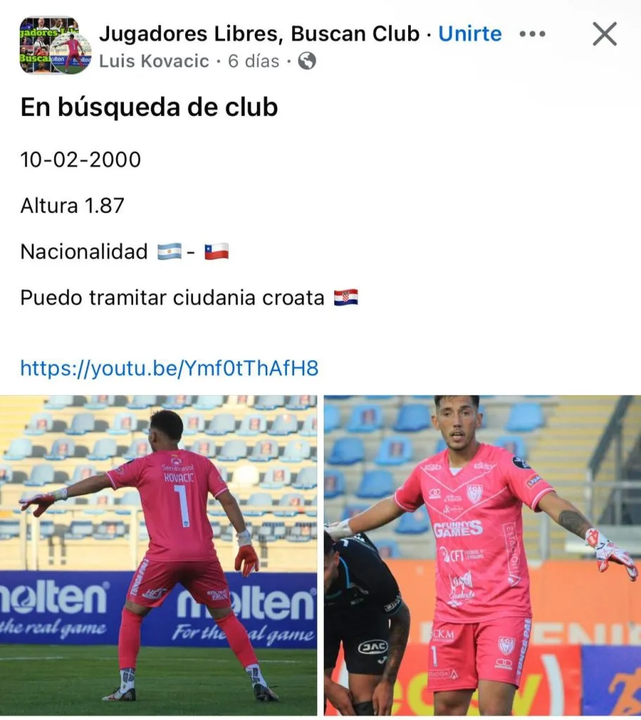 Tras formarse en Belgrano y arribar a O’Higgins bajo el scouting celeste en sus series menores, hoy Luis Kovacic sorprendió en Facebook. El portero de 26 años figura en la cuenta “Jugadores Libres Buscan Club” ofreciendo sus servicios.