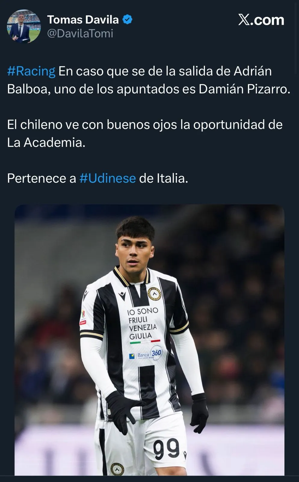 “Racing en caso de que se de la salida de Adrián Balboa, uno de los apuntados es Damián Pizarro. El chileno ve con buenos ojos la oportunidad de la Academia; pertenece al Udinese”, explicó.