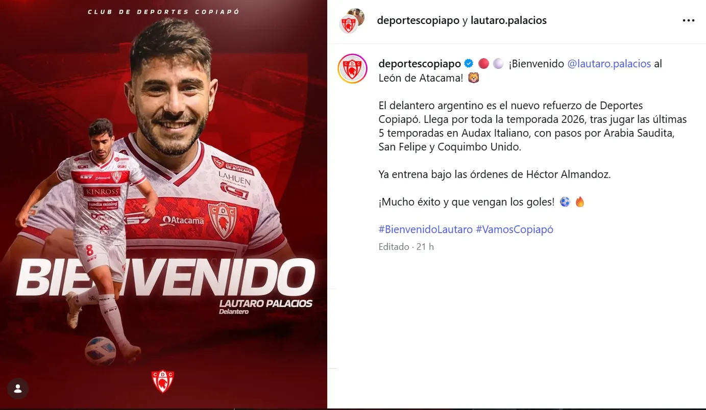 A través de sus redes, el equipo confirmó la llegada del delantero al equipo. “¡Bienvenido Lautaro Palacios al León de Atacama! El delantero argentino es el nuevo refuerzo de Deportes Copiapó”.