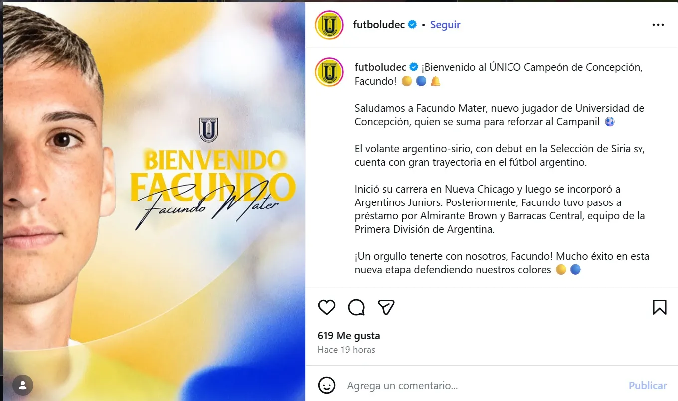 A través de sus redes sociales, el cuadro de Conce anunció el fichaje de Facundo Mater, futbolista argentino-sirio que juega de volante. “¡Bienvenido al ÚNICO Campeón de Concepción, Facundo!”.