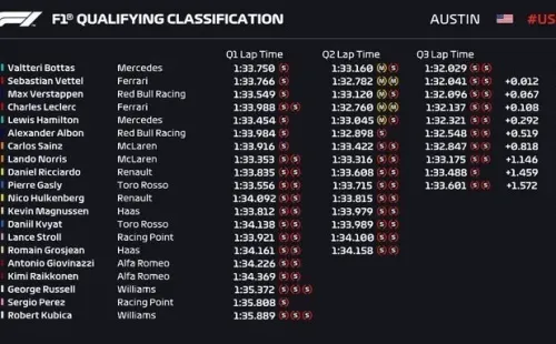 El podio de partida en Austin lo completarán Sebastian Vettel y Max Verstappen, seguidos por Charles Leclerc y Hamilton, quienes dan seguridad de una entretenida lucha por las primeras posiciones, más allá de que el campeón ya parezca definido.