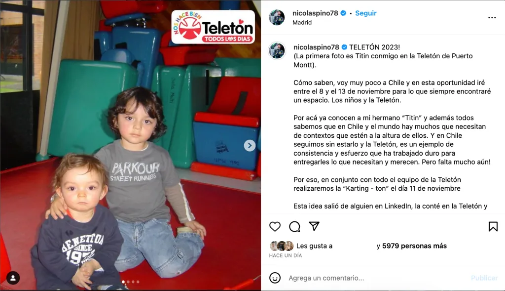 El segundo lo donará a la Teletón para que lo subasten, con el diseño que gane el concurso. “¿Por qué hago esto? Los que tienen familiares con necesidades especiales o capacidades diferentes saben que esto se hace solo por amor. Y en mi caso, no hay nadie que quiera más en la vida que al Titín y nadie que me quiera más que él a mí”, reveló Nico Pino.