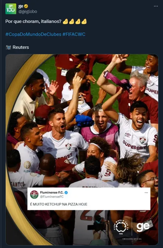 El mundo del fútbol no tardó en reaccionar. Por ejemplo, Globo Esporte en sus redes sociales se aprovechó de un posteo del club para cargar a los italianos. “¿Por qué lloran, italianos?”, acompañado de algunos emojis.