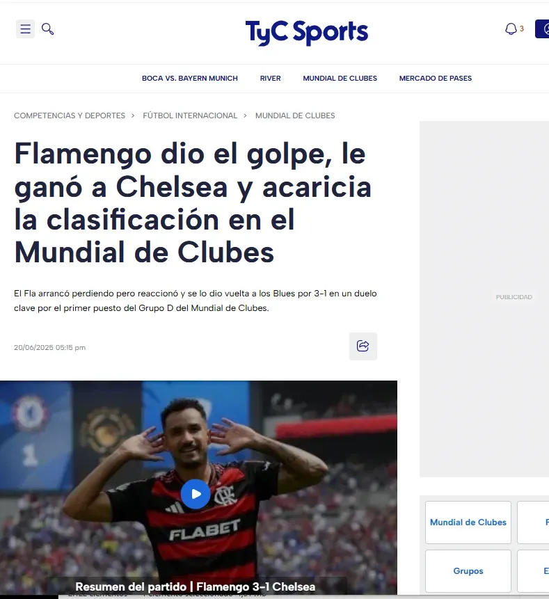 Bolavip Brasil, mientras tanto, lo tituló de la siguiente forma.“Flamengo vence a Chelsea por 3-1 y es líder de su grupo por el Mundial de Clubes 2025”, destacando la apertura de la cuenta de Pedro Neto, pero como dieron vuelta la llave.