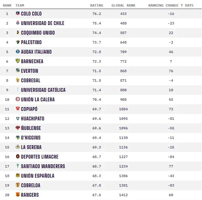 Es seguido por Universidad de Chile que está en el puesto 488 con 75,4; luego Coquimbo Unido con 74,4 en el 587, Palestino en el puesto 648 con 73,7 y cerrando el Top 5 aparece Audax Italiano, en el lugar 772 con 72,8.