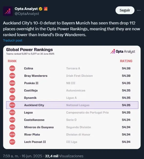 “La derrota por 10-0 del Auckland City ante el Bayern Munich le hizo caer 112 puestos de la noche a la mañana en el Opta Power Rankings”, destacó la cuenta oficial de la plataforma.