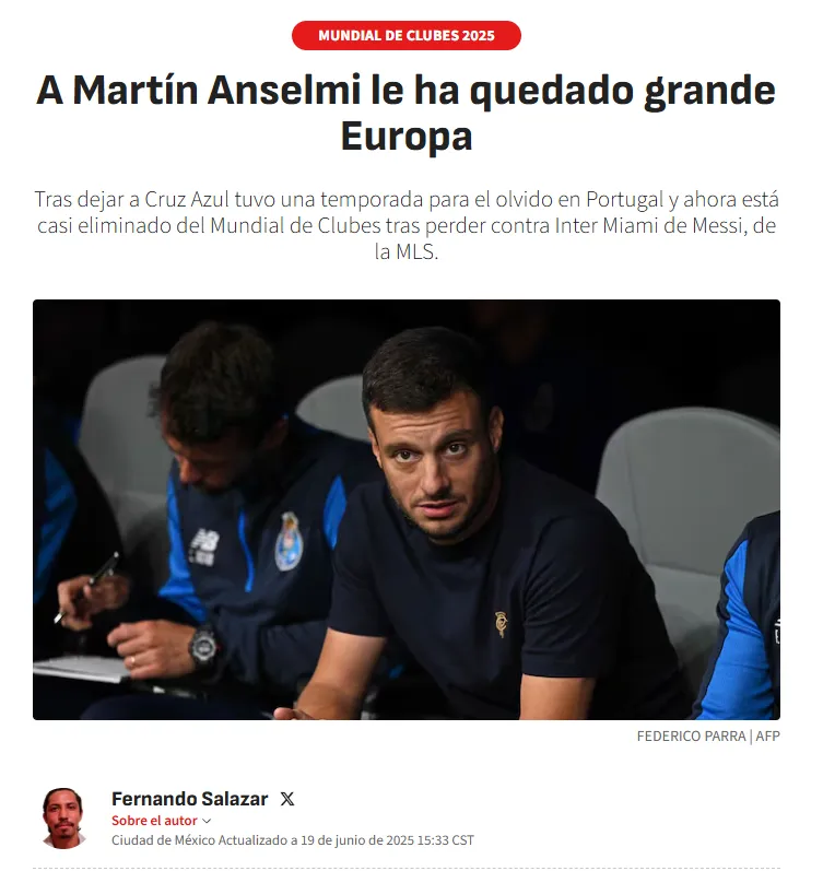Por eso, no tuvieron piedad en ir con todo contra Martín Anselmi tras la victoria del cuadro de Messi. En AS México dispararon sin filtro: “A Martín Anselmi le ha quedado grande Europa. Tras dejar a Cruz Azul tuvo una temporada para el olvido en Portugal y ahora está casi eliminado del Mundial de Clubes”, dijeron.