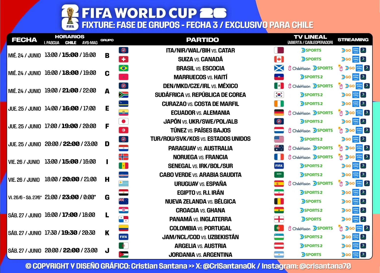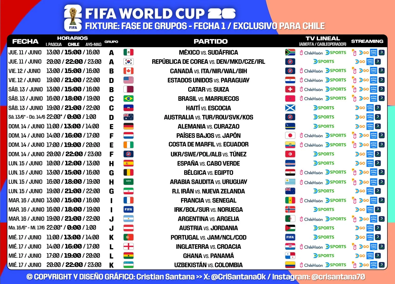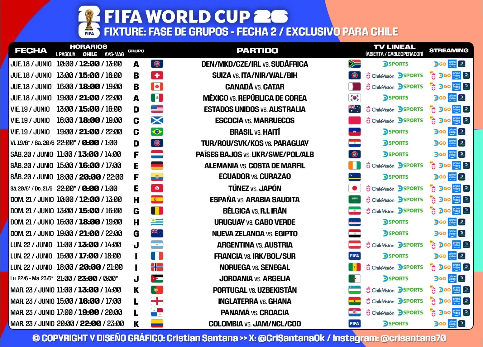 Por lo mismo, fue el colombiano Gustavo Torres (@TorresTavo) quien se adelantó a todos en sus redes sociales para señalar los encuentros que serán televisados en Chile por TV abierta, lo que fue confirmado también por el experto en redes Cristian Santana (@CriSantanaOk).