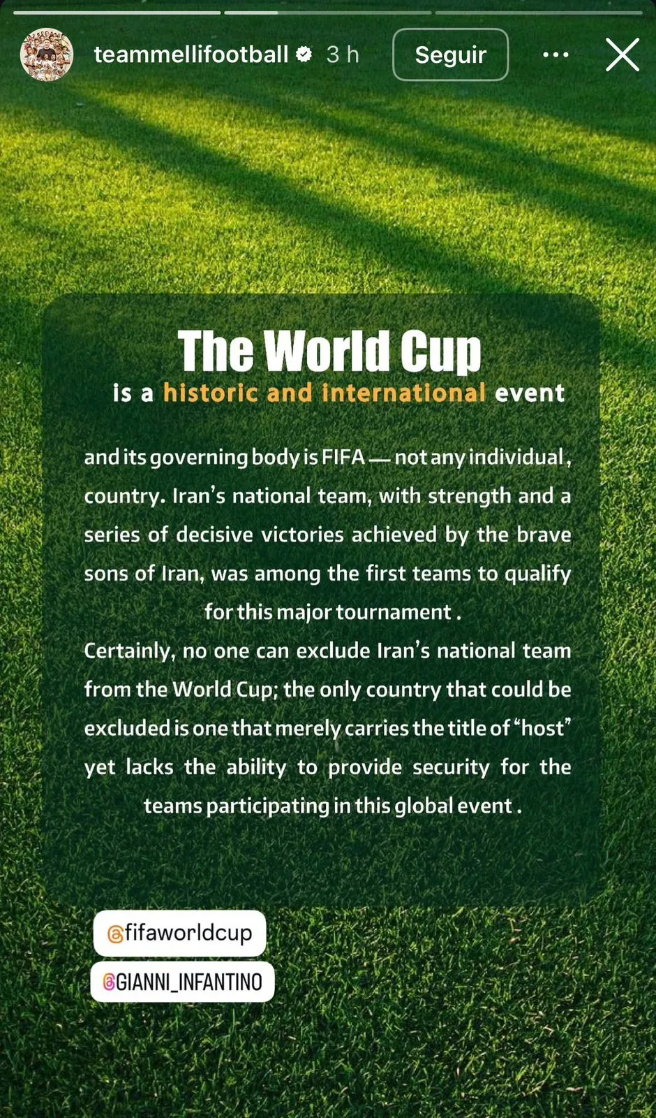 En su declaración, el organismo iraní etiquetó a Gianni Infantino y a la propia cuenta de la Copa del Mundo 2026 para recalcar que la cita es un evento global organizado por la FIFA, por lo que ningún país puede decidir de forma unilateral quién participa o no del torneo.