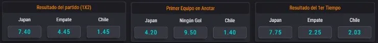 Las cuotas de coolbet.cl indican que ante Japón, La Roja es el amplio favorito, dado que un triunfo de Chile paga 1,45 veces lo apostado, mientras que la victoria japonesa tiene una cuota de 7,40. Para quienes quieran apostar al empate, el factor es de 4,45.