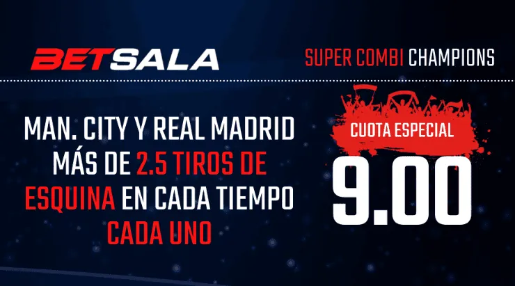 Pero si quieres jugar con todo, aprovecha la Super Combi Champions de Betsala, porque si piensas que Manchester City y Real Madrid tendrán más de 2,5 tiros de esquina cada uno, en cada tiempo, paga 9,00 veces en su cuota especial.