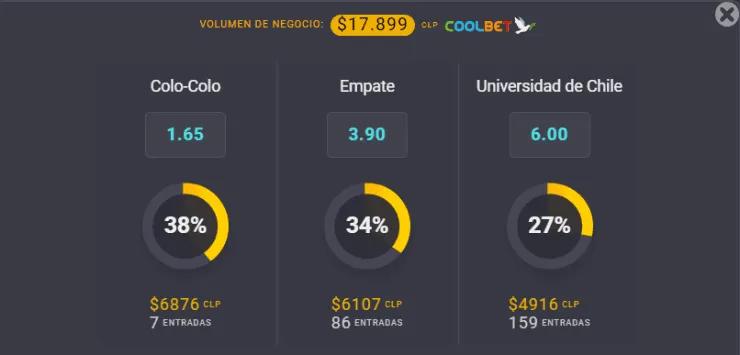 Para el OSO de Coolbet, el gran favorito para ganar este Superclásico del Campeonato Nacional es Colo Colo, que gana 1.65 veces lo que juegues, por sobre los 6.00 que paga Universidad de Chile si crees que serán los vencedores. Ahora, el empate entre ambos paga 3.90 veces lo que juegues.