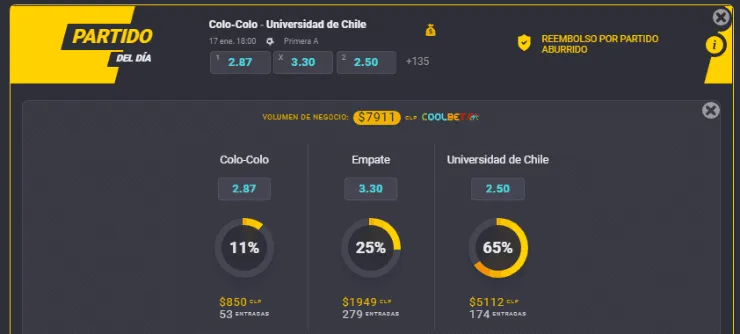 ElOSO de Coolbette cuenta que el Superclásico 188 es el PARTIDO DEL DÍA: Por lo que si termina 0-0 se devuelve tu apuesta en hasta $15.000 si ocurre. Pero, al mismo tiempo, dice que el favorito para ganar en el Estadio Monumental es Universidad de Chile, que paga 2.50 veces lo que apuestes por sobre los 2.87 que paga Colo Colo si piensas que los albos se impondrán en el Estadio Monumental. Ahora, si te la juegas por el empate, paga 3.30 veces lo que juegues.