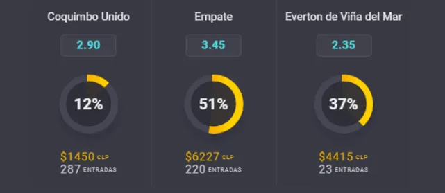 Para el OSO de Coolbet, el favorito para ganar en esta llave de semifinales de la Copa Chile 2021 es Everton de Viña del Mar, que paga 2,35 veces lo que juegues por sobre los 2,90 que paga Coquimbo Unido, si crees que los piratas ganan el partido. El empate en los 90 minutos paga 3,45 veces lo que juegues