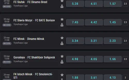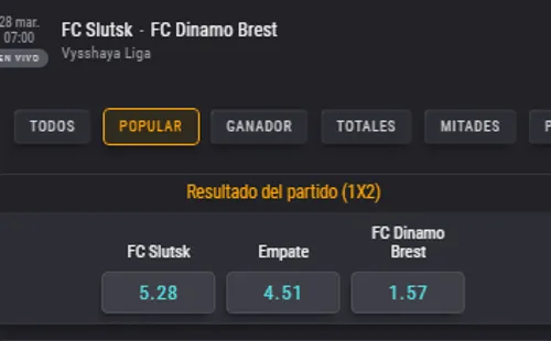 El OSO de Coolbet te cuenta que el favorito en este partido es elDinamo Brest, que paga 1.57 veces lo que juegues. Si te la juegas por Slutsk, este paga 5.28 veces lo que apuestes. El empate, paga 4.51 veces.