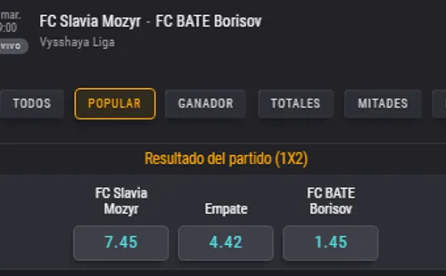 Para el OSO de Coolbet, el favorito para vencer en este partido es el BATE, que paga 1.45 veces lo que juegues. Si crees que empatarán, paga 4.42 veces lo que apuestes, pero si piensas que el vencedor será Slavia Mozyr, paga 7.45.