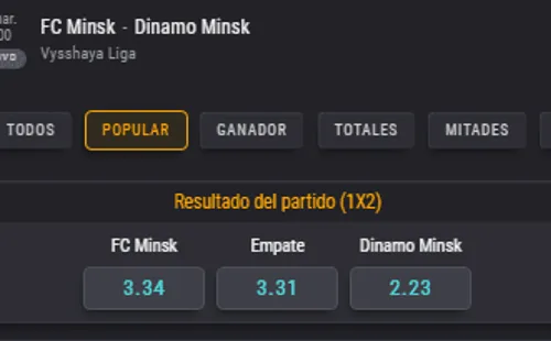 El OSO de Coolbet te cuenta que el favorito para ganar este partido de la Liga de Bielorrusia es el DInamo Minsk, que paga 2.23 veces lo que juegues, contrario a los 3.34 que paga Minsk. El empate, para los más moderados, paga 3.31.
