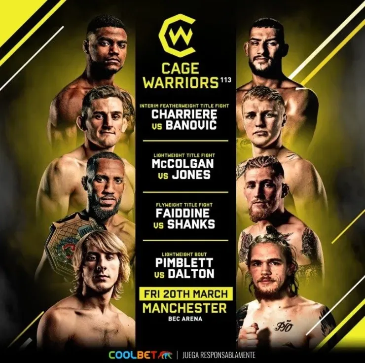 Si también quieres dar emoción de la mano de Coolbet, también puedes probar en las Artes Marciales Mixtas. En Inglaterra, el circuito de Cage Warriors se disputa a puertas cerradas, y en Manchester tendrá la edición 113 de Cage Warriors la tarde de este viernes 20 de marzo, el que nos guarda la siguiente cartelera para que te la jueges con el OSO de Coolbet.