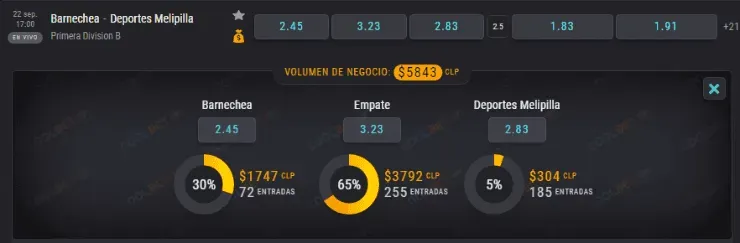 Para el OSO de Coolbet, el favorito para ganar este partido de la Primera B es Barnechea, que paga 2.45 veces lo que juegues, por sobre los 2.83 veces que paga Deportes Melipilla. Si crees que termina en empate, paga 3.23 veces.