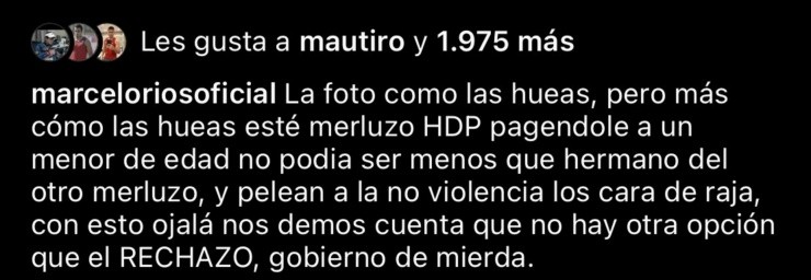 Ríos no se guardó nada. “La foto como las hueas, pero más como las hueas este merluzo HDP pegándole a un menor de edad. No podía ser menos que hermano del otro merluzo. Y pelean a la no violencia los cara de raja. Con esto ojalá nos demos cuenta de que no hay otra opción que el rechazo, gobierno de mierda”, fue el mensaje que compartió pasado el mediodía.