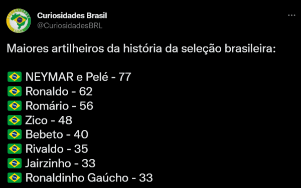 En el segundo lugar aparece Ronaldo, con 62 tantos. Y en el cuarto lugar asoma Romário, quien alcanzó 56 dianas en su experiencia internacional. Zico es el quinto artillero con 48 anotaciones. Y Bebeto es el sexto gracias a sus 40 celebraciones.