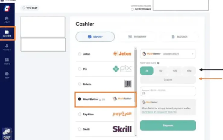 2. Seleccione Depósito y MuchBetter como método de pago, como se muestra a continuación en el cuadro resaltado.