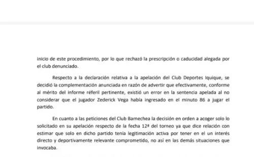Respecto a la denuncia hecha por Deportes Iquique, se declaróque “efectivamente, conforme al mérito del informe referíl pertinente, existió un error en la sentencia apelada al no considerar que el jugador Zederick Vega había ingresado en el minuto 86”, es por eso que se dictaminóa Iquique comoganador por 3-0.