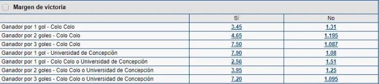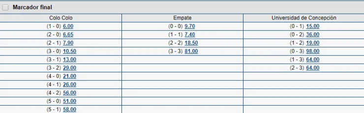 Ya en las cuotas como tal, Colo Colo es el favorito para quedarse con el partido, que en Marathonbet paga 1.54 veces lo que juegues. En tanto, el triunfo de la Universidad de Concepción paga 6.25 veces lo que apuestes, y el empate paga 4.15 veces lo que juegues.