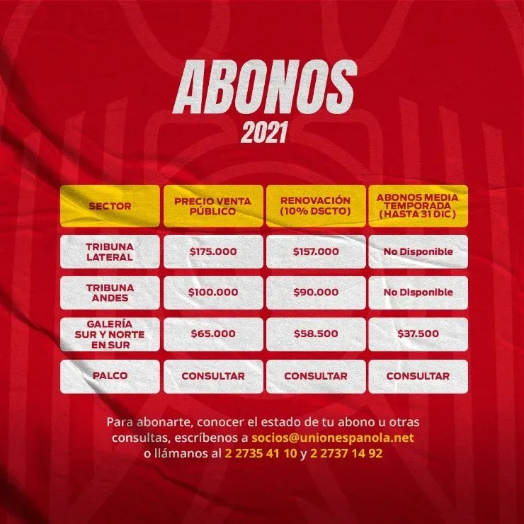 También, Unión Española puso a disposición la campaña de abonos para la temporada y media temporada, con los respectivos números de contacto.