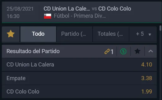 El favorito para ganar en la jornada 18 del Campeonato Nacional 2021 entre Colo Colo y Unión La Calera es el cuadro de Gustavo Quinteros, que paga en Betsala 1,99 veces lo que juegues, por sobre los 4,10 que paga los de PaquiMeneghini si crees que ellos se imponen de local. Ahora, el empate entre ambos paga 3,38 veces lo que apuestes en esta jornada.