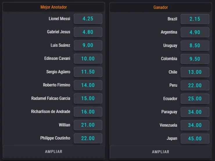 El gran favorito para titularse campeón según coolbet.cl, es el local Brasil que está pagando 2,15 veces lo apostado. Luego le sigue Argentina con una cuota de 4,90, mientras que Uruguay aparece como el tercer gran candidato con un factor de 8,50. Chile en tanto, el campeón defensor, entrega una cuota de 13,0 en caso de coronarse como bicampeón del Torneo Continental.