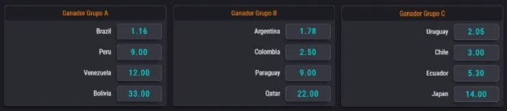 Por medio de coolbet.cl podrás jugar y apostar partido a partido pronosticando quien será el ganador de cada encuentro con cuotas superiores a las que entregan otras plataformas como Bet365, y entregándote además otras entretenidas opciones, invitándote a adivinar quién ganará cada grupo, y también en forma exclusiva, a apostar desde ya por quien será el gran goleador del campeonato donde candidatos como Lionel Messi, Gabriel Jesús y Luis Suárez entre otros, tienen un factor de pago superior a 4,0.