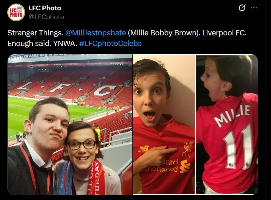 Millie Bobby Brown, que interpreta a Eleven en la producción, es hincha del Liverpool, pasión que heredó de su familia y se le ha visto en distintos encuentros de los Reds.