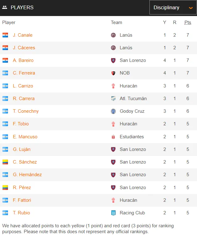Los paraguayos de Lanús José María Canale y Juan José Cáceres son los que peor comportamiento mostraron. Ambos tienen una amonestación y dos expulsiones. Detrás de ellos está el también guaraní Antonio Bareiro, de San Lorenzo de Almagro: cuatro amarillas y una roja dice el registro del atacante. También aparecen los colombianos Carlos Sánchez y Rafael Pérez, también del Ciclón.