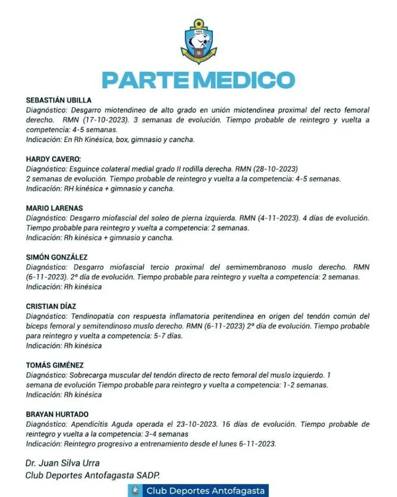 Deportes Antofagasta cerró la fase regular de la Primera B con cinco partidos sin victorias. Y tiene un hospital a poco de comenzar la acción en la Liguilla de Ascenso con el objetivo claro de volver a la élite del fútbol chileno. Hardy Cavero, Cristián Díaz y Simón González también figuraban en el parte.