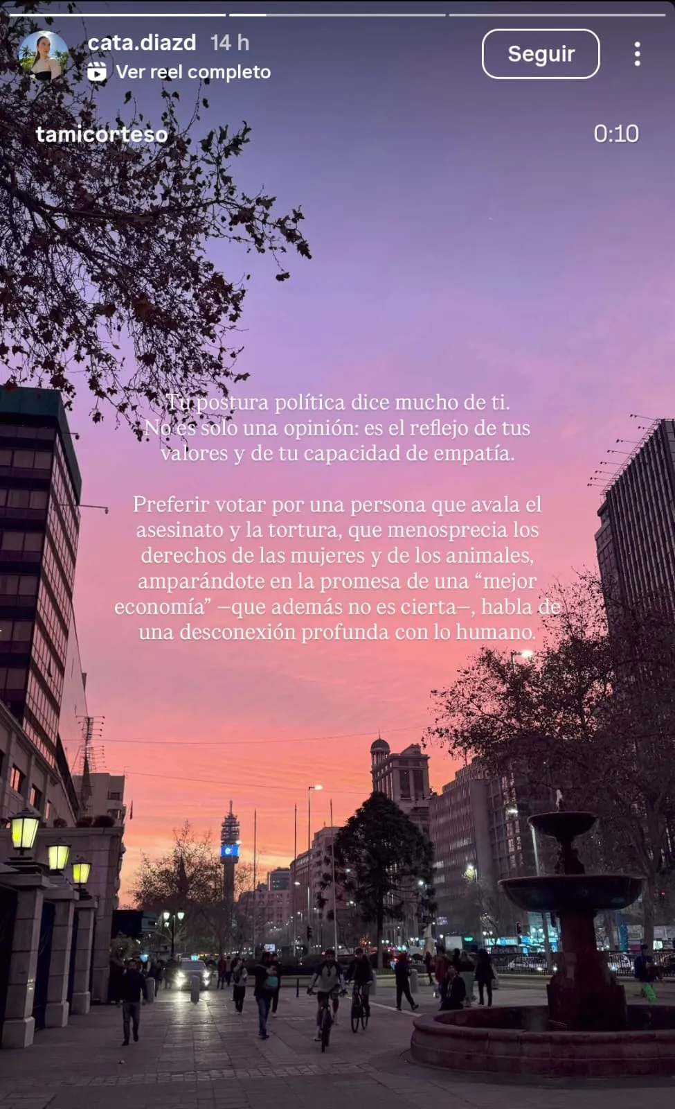 “Preferir votar por una persona que avala el asesinato y la tortura, que menosprecia los derechos de las mujeres y los animales, amparándote en la promesa de una “mejor economía”…”, fue parte del mensaje.
