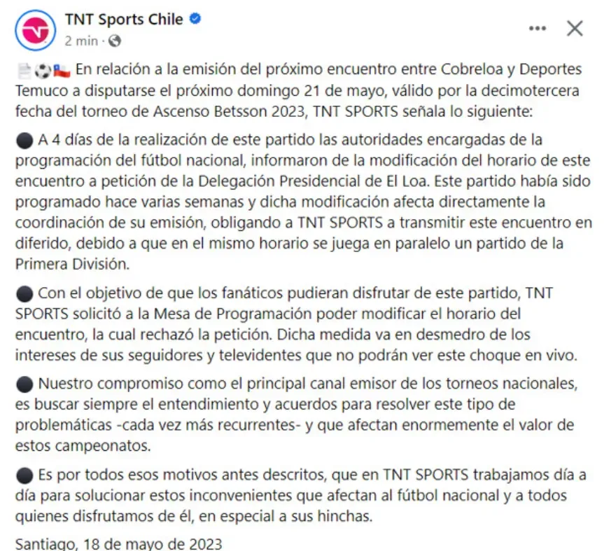 TNT Sports tenía en su agenda transmitir el partido entre Cobreloa y Deportes Temuco, que en primera instancia estaba pactado para el domingo 21 de mayo a las 20 horas. Pero sufrió un cambio de horario y, a raíz de esa modificación, la señal deportiva no podrá pasar en directo aquel duelo de la 13° fecha en el Campeonato Ascenso.